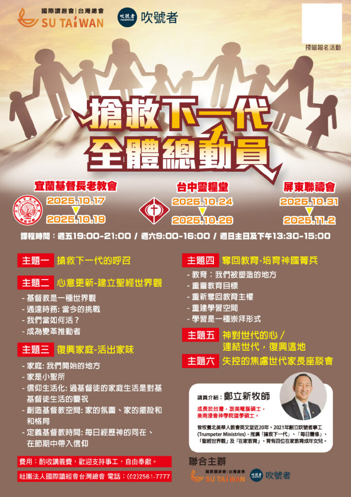 24 7 月, 2025 22 8 月, 2025 最新消息 研習以支持事工,酌收報名費500元 台中靈糧堂兄姐請在小組裡統一線上報名及收費,小組長收齊費用後交給珮芬同工,始完成報名。 收費:酌收報名費500元。 若需要代訂周六午餐餐盒(含飲料),另加收每人150元 報名截止日: 請盡速於8月底搶先報名 點擊這裡 限台中靈糧堂會友報名專屬連結((台中場)