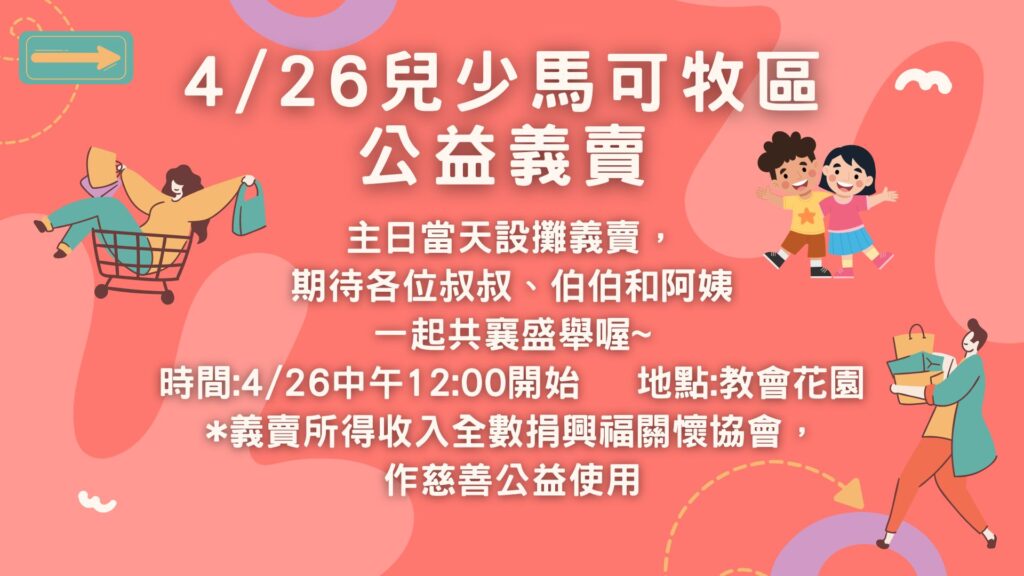 Home 最新消息 4/26兒少馬可牧區公益義賣