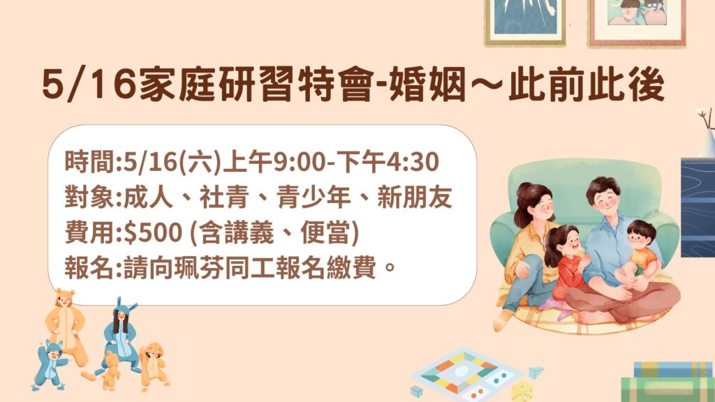 Home 最新消息 5/16家庭研習特會-婚姻~此前此後
